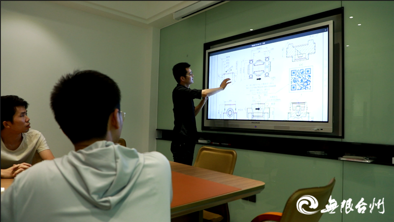 在会议室里,浙江斯丹特阀门股份有限公司的负责人正在和玉环水暖阀门产业创新服务综合体的技术人员讨论电磁阀项目的研发情况。